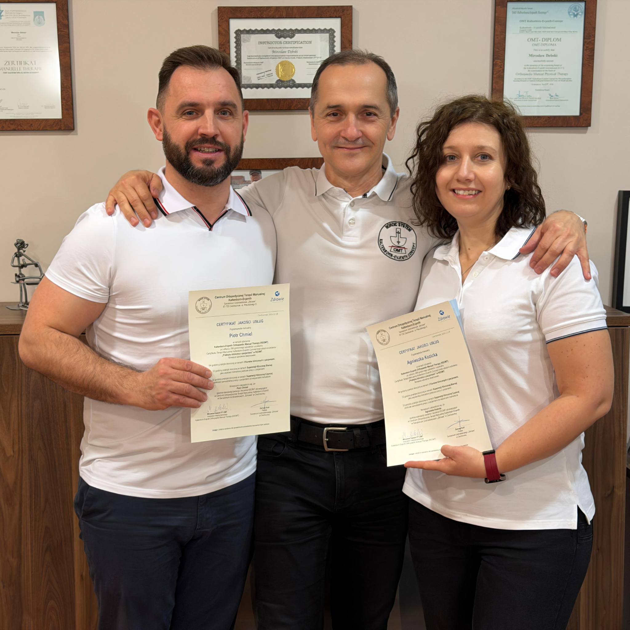 z dumą informujemy, że Piotr Chmiel oraz Agnieszka Kozicka – fizjoterapeuci z naszego Centrum Medycznego, uczestniczyli w dniach 15-18 grudnia 2025 w Superwizji Klinicznej Czynnej KEOMT, która odbyła się w Centrum Ortopedycznej Terapii Manualnej w Ciechocinku.